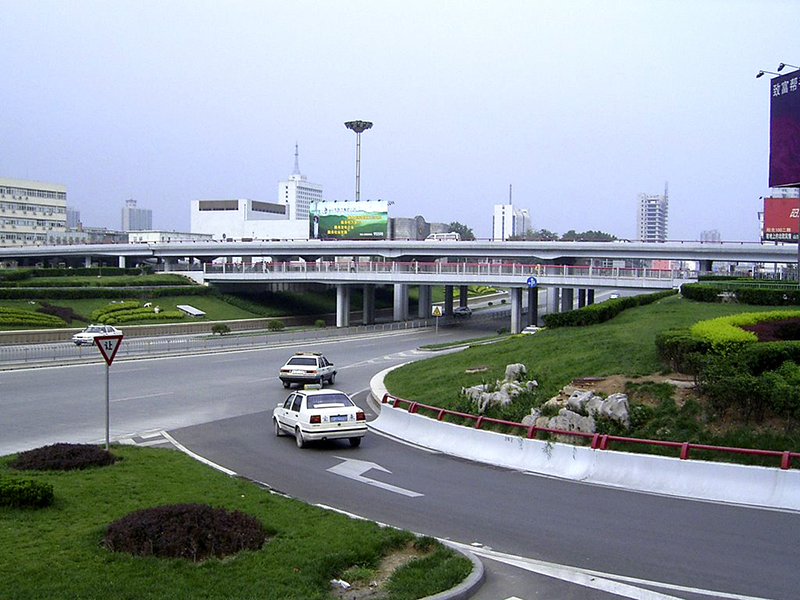 為苜蓿葉形三層互通式立交,兩條主干路均寬 50 米,橋梁上部采用簡支箱梁,寬腹 T 梁及三孔連續(xù)板結(jié)構(gòu),預(yù)制安裝,施工簡單;下部蓋梁為暗藏式,墩身采用蝙蝠式柱,外形美觀;基礎(chǔ)為鋼筋砼擴大基礎(chǔ)及灌注樁;該立交充分利用原有排水系統(tǒng),雨污水完全自流,經(jīng)濟合理。榮獲市長金杯獎,被評為泉城十大景觀之首。