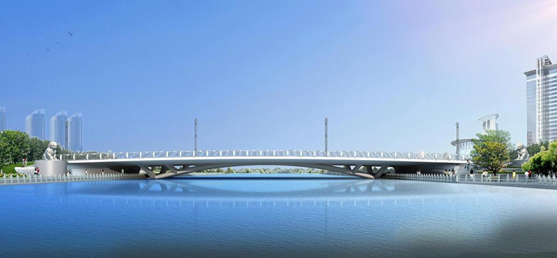匯智橋路南、北橋均為無背索獨(dú)塔單索面斜拉橋,橋跨 82 米,全寬 33.5 米;智力島路橋?yàn)閱慰缧滦托笨渴焦?/span>