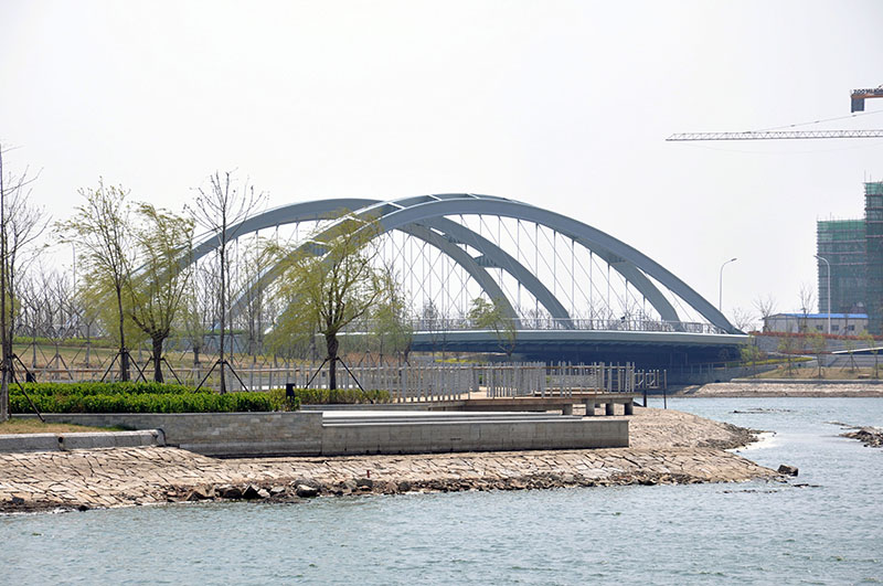 肋下承式梁拱組合體系橋,橋跨 70 米,寬度 33.5-42.9 米;聚賢橋路南橋?yàn)樯铣惺搅汗敖M合橋,橋跨組合為